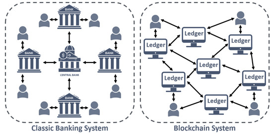 Illustration of the differences between the classic banking system (left) and the blockchain system (right).