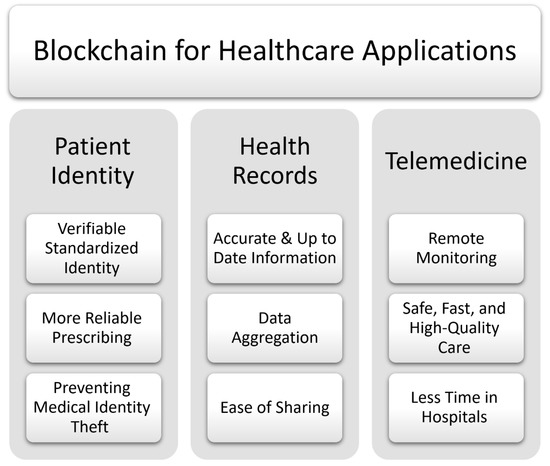 Despite the significance of medical data sharing, health systems usually compel a patient to collect and exchange his/her medical information with medical staff, either in print form or electronically on some storage devices. This method of distributing medical records is inefficient since it is slow, insecure, and incomplete. Moreover, it is “provider-centric” instead of being “patient-centric”. The inefficiency of this sharing method is mainly due to the lack of credibility between healthcare institutions and the lack of interoperability between the different IT platforms used by these institutions. According to [57], healthcare interoperability should cover three main levels, namely: foundational, structural, and semantic. This interoperability issue may be solved using blockchain technology [58,59]. Indeed, with blockchain implementation, patient medical information will be shared with necessary permissions using smart contracts for controlling operations, such as the change of viewership rights or the creation of new records. Next, we consider some examples of the use of blockchain technology in the healthcare field [60] (Figure 4):