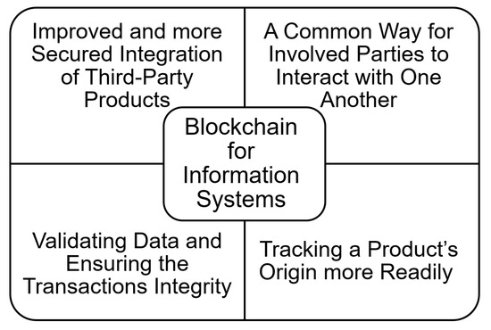 An information system [78] is a collection of many different types of data that ensures the achievement of a business goal. Information systems are not really stand-alone IT business models. Integration with data and business processes, on the other hand, is a critical part of successful implementation. As a result, it is indeed easier to visualize the information system as a triangle. Processes, people, and computers are represented by the three elements of this triangle. To be successful, an information system must have all of these components working properly. The choice to integrate blockchain technology into information systems allows organizations to benefit from the vast array of applications and advantages that blockchain offers [79,80,81] (Figure 5).