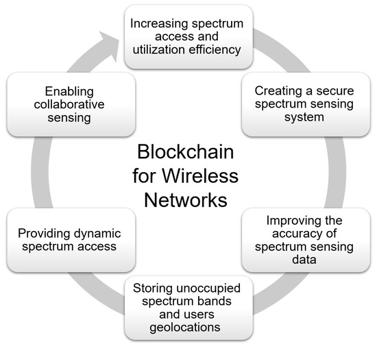 Spectrum management using blockchains is a new application with a lot of opportunities and challenges. Spectrum sensing and geo-location databases are the two main technologies used for providing dynamic spectrum access. Previously, these approaches were viewed as separate strategies in previous research. Because blockchain is a database technology, it may be used to create a unified method in which spectrum sensing techniques and geolocation database technology work in tandem. A more robust dynamic spectrum management framework will arise from combining these two spectrum access strategies. It is also necessary to investigate the integration of blockchains with the communication networks. The blockchain network could be set up as an overlay on top of the communication network, allowing communication network nodes to operate as complete nodes on the blockchain network. This network structure, however, is energy-intensive and necessitates a specialized control channel for transferring blocks and transactions over blockchain networks [110]. The possible applications of blockchain technology for wireless networks are illustrated in Figure 6.
