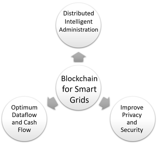A smart grid [129,130,131,132] is a digital communications-based electrical network that provides for the two-way flow of electricity and data, and also the identification, reaction, and avoidance of changes in usage and other difficulties. Current smart grids integrate communication and control techniques into power networks, allowing for considerable gains in energy efficiency and system safety. Traditional centralized techniques of managing smart grids pose significant hurdles. For instance, the centralized control method creates a dangerous single point of failure for the whole grid. In addition, many security issues have been growing and external security assaults could result in significant financial losses. To overcome these limitations, the use of blockchain technologies is considered a good choice in several research and industrial projects [133,134,135]. Indeed the use of blockchain for smart grids may have the following advantages (Figure 8):