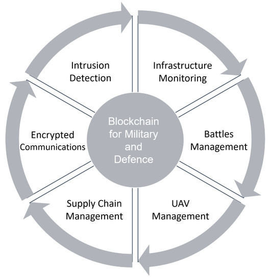 - Zhu, Y.; Zhang, X.; Ju, Z.Y.; Wang, C.C. A study of blockchain technology development and military application prospects. In Journal of Physics: Conference Series; IOP Publishing: Bristol, UK, 2020; Volume 1507, p. 052018. [Google Scholar]