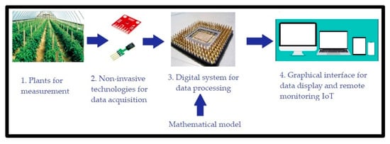 - Implement the developed mathematical model in a digital system. Such system should estimate net photosynthesis through non-invasive techniques, besides being able to work for in vivo, in situ, in vitro, portable, and on a small-scale measurement. In order to implement this, we propose the use of a digital system combined with a communication system capable of measuring greenhouse variables. The system records the measured magnitudes in a database with remote IoT access. A general scheme of this proposal is observed in Figure 1.