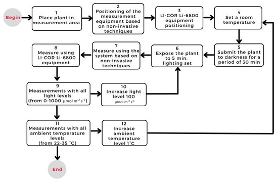 In order to carry out a validation process of the net photosynthesis estimation system based on non-invasive techniques, it is necessary to carry out a process of experimentation and comparison. This process was carried out against the LI-COR Li-6800 photosynthesis measurement equipment. Therefore, the experimentation methodology is shown in Figure 2.
