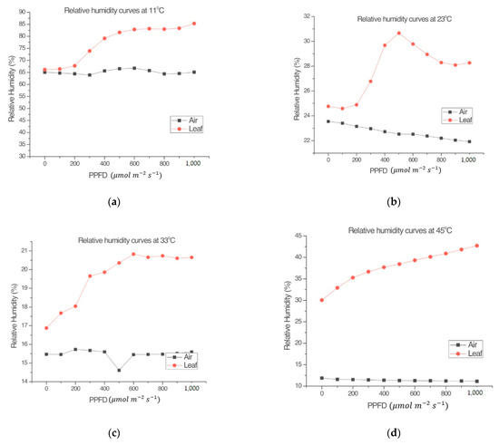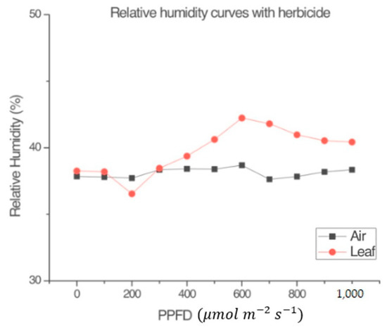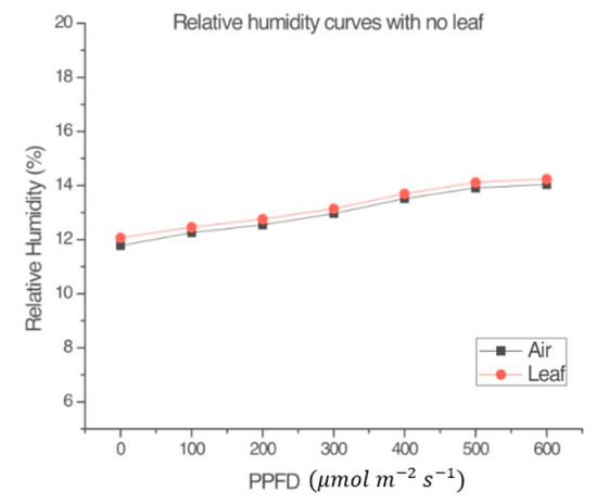 Previous experiments [4] have shown that the LI-COR Li-6800 lamp alone does not contribute to temperature effects in measurements. The present study also measured the effect of the lamp on the relative humidity inside the chamber. To establish baseline measurements, the light–response curves procedure (Section 2.4) was repeated.