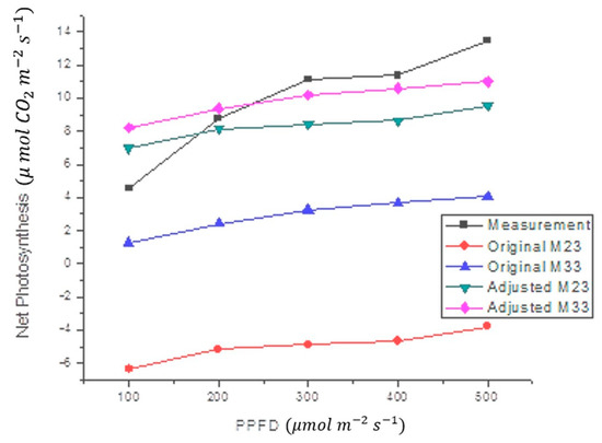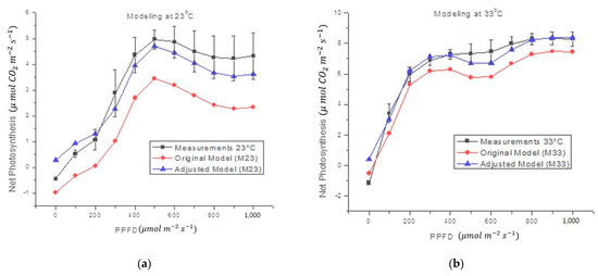 It is a known fact that there are marked physiological changes between plants of different phenological stages, even if they are of the same species. In addition, there are behavioral differences in the leaves of a single plant depending on their size and age. The proposed model was obtained from measurements in the seventh leaf of plants in the stage with 12 leaves in two different case study species: Capsicum annuum L. and Capsicum chinense Jacq., under controlled conditions (Ta from 23 to 33, 23, and 33 °C, and R in the range of 0–1000 µmol m−2 s−1). The proposed model reached average errors of 3% in Capsicum annuum L. and 18.4% in Capsicum chinense Jacq., in comparison with the IRGA. In all cases, the correlation coefficients (Rho) are >0.98 (Table 5), which means that the proposed model correctly follows the shape of the NP measured experimentally in the case study plants. In addition, it was shown that the same model significantly reduces the mean error within the measurements in plants of different species, only correcting the compensation adjustment (Oa) (see Figure 6 and Figure 7, Table 4 and Table 5).