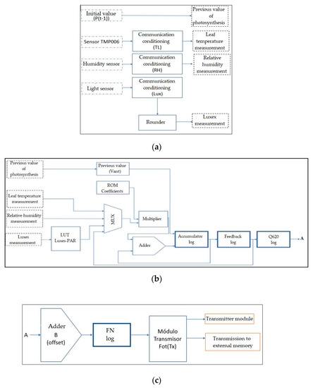 The implementation of the mathematical model mentioned in Section 2.2 was carried out in a Field Programmable Gate Array (FPGA). FPGAs have advantages such as: high-speed processing, high reconfigurability, and parallel acquisition that ensures that all the variables of interest are taken at the same time [54]. Due to these advantages, FPGAs are being used currently in agronomical applications where high-demand computational resources and fast data acquisition are necessary; thus, gaining high popularity [55,56,57]. All these advantages allow FPGAs to calculate the photosynthesis process in situ and in real time, which is desirable in applications of prediction of physiological processes. The present system uses a DE2 board from ALTERA, which includes a Cyclone II FPGA for this work. This FPGA contains 35,000 logic cells, and the DE2 card contains useful peripherals for this project, such as a set of buttons, switches, LED indicator, and a RS-232 serial communication port [58].