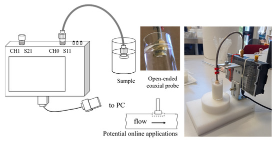 Among all the techniques, the network analyzer coupled with the coaxial probe is a well-established technique concerning food analysis, and consider low cost, real-time, and non-destructive measurement with a quite high accuracy, as documented by the literature [1,2,8]. In addition, the open-ended coaxial probe provides more detailed information than that of TDR sensors [5,9]. The open-ended coaxial method is based on the scattering parameters measured as the sample response, particularly the reflection caused by impedance mismatch at the end of the line [9,10]. The dielectric properties of the sample are then derived from this impedance discontinuity, even though non-resonant methods are not the best for dielectric properties calculation [10]. Furthermore, consider that the liquid sample can be analyzed without any preparation requirement in a broadband capability [11].