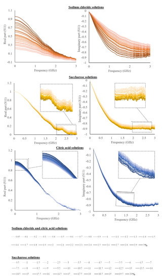The real part of S11 of both sodium chloride and citric acid solutions decreases as a function of concentration and the opposite trend is revealed for the imaginary part. On the other hand, saccharose showed a decrease of both real and imaginary parts.