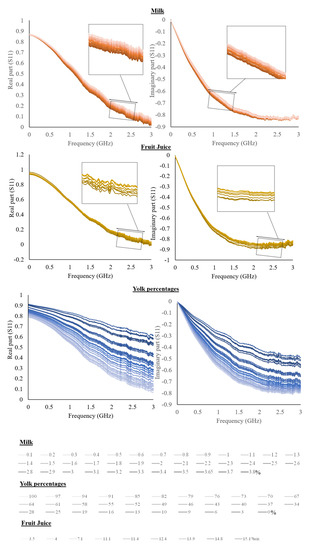 By increasing the percentage of the yolk of egg products, a decrease in both the real and the imaginary parts can be observed; the huge variation is dependent on the very large range investigated. Egg white and yolk were previously characterized by Kudra, obtaining values much closer to water when the egg white is considered than when the yolk is considered. Yolk samples had lower values of dielectric constant and loss factor [30]. Finally, as the °Brix of fruit juices increases, the imaginary part of the S11 increases, while the real part increases to about 1.2 GHz and subsequently decreases, showing a frequency dependence.