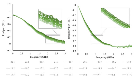 The temperature measurements were made with a digital thermometer, at the same time as the electrical measurements. The real and imaginary part of S11 decrease as a function of temperature raise, and as expected, shows a frequency dependence (Figure 4). The temperature influence on waveforms could be overcome by applying a correction coefficient, carrying out temperature-dependent calibration models, or simply selecting the frequency range where the influence is negligible. This aspect could be helpful for sensor development, considering the milk production and storage temperature. Similar behavior is expected for the other used solutions and liquid foods since they contain a large amount of water.