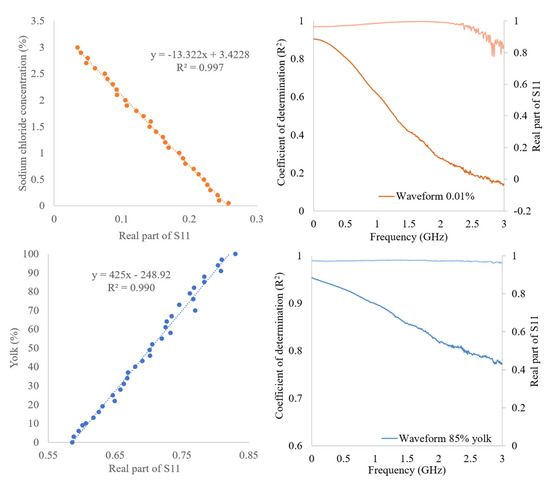 The figure also shows the fitting of the best point (at the determined frequency) between the real part of S11 and the constituent concentration. In addition, the R2 trend and a spectrum to underline the frequency portion with a better contribution to the estimation ability of the model are shown. As it can be seen, the coefficients of determination obtained remain high for the whole frequency range, confirming that a very good prediction is supported by a wide spectral region and not only a few points.