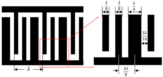 The SAW device used in this study was based on an ST-X quartz substrate and was fabricated using semiconductor lift-off and sputtering technology. A dual-track structure was adopted to reduce the effects of environmental factors. The input/output interdigital transducer (IDT) in each channel adopted the EWC/SPUDT structure and was combined with the reflection grating on both sides of the channel to form a two-port resonator [19]. Figure 1 presents a magnified image of the EWC/SPUDT structure, in which the width of the wide electrode was λ/4; the width of the narrow electrode was λ/8; the distance between the wide and narrow electrodes was 3λ/16; and the distance between the two narrow electrodes was λ/8. The center of activation was positioned 3λ/8 to the left of the wide electrode center, enhancing the power of the positive signal and effectively reducing the insertion loss [22,23]. The operating frequency of the SAW sensor was 98.5 MHz with an IDT period of 32 μm; the number of pairs of input and output EWC IDTs was 106, and the overlapping length was 1 mm (31λ); the delay-line distance between each pair of input and output IDTs was 600 μm; there were 150 strip gratings on each of the two sides [19]. The IDTs and gratings were aluminum, and the size of the dual-track structure was 15.3 × 5.8 mm2. Figure 2 presents a top view of the EWC/SPUDT SAW sensing chip employed in this study.