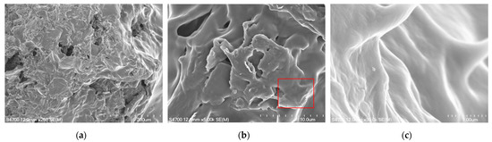 Figure 4 depicts 250×, 5000×, and 30,000× FESEM images of the film. As shown in Figure 4a,b, there were numerous holes and wrinkles on the film’s surface, and layered accumulation is the typical form of rGO. This indicated that rGO and DPP2T-TT had been satisfactorily synthesized, and the film exhibited a satisfactory rough surface. Wrinkles were available as adsorption sites in rGO and would induce adsorption, which could enable effective gas sensing through an increased surface area for gas adsorption [24,25]. The 30,000× image in Figure 4c is a magnified image of the area highlighted with a red frame in Figure 4b and depicts various wrinkle patterns on the film surface, which also increased the overall adsorption surface area, enabling effective ammonia adsorption.