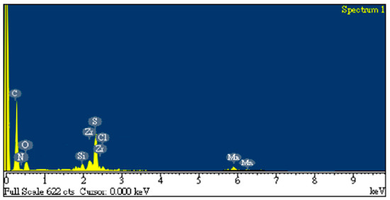 Figure 5 depicts the EDS mapping of the rGO/DPP2T-TT composite film, which displays the element’s distribution because DPP2T-TT is formed through the polymerization of diketopyrrolopyrrole (C6H2N2O2), thiophene (C4H5S), and pyrrole (C4H5N). Therefore, in the EDS image (Figure 5), carbon was provided by these three chemical substances and rGO, oxygen was provided by diketopyrrolopyrrole, nitrogen was contributed by pyrrole, and sulfur was provided by thiophene.