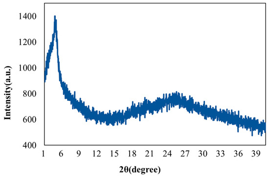 Figure 6 illustrates the XRD analysis on the rGO/DPP2T-TT composite film, which reveals a visible and intense diffraction peak between 3° and 5°. According to a previous study [19], the peak was caused by the chemical structure side chain of DPP2T-TT. A broadened diffraction peak was also noted between 15° and 30°; this peak was caused by rGO [26]. Thus, an rGO/DPP2T-TT composite film was successfully prepared.