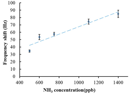 where Δf indicates the change in frequency response, and ΔC indicates the change in ammonia concentration. According to the data listed in Table 1, the sensitivity of the SAW sensor was 55 Hz/ppm. A slightly longer period was required for this SAW sensor to return to its initial value after the NH3 gas concentration decreased to zero; according to [30], this is because the strong bond between the rGO and ammonia increased the time required. The minimal detectable concentration for the sensor was the concentration detected at a signal-to-noise ratio of 3. When the sensor detected 500 ppb ammonia, its frequency response was 35 Hz and the noise level was 9.9 Hz, so the signal-to-noise ratio was calculated as 3.53. Accordingly, the estimated detection limit of the proposed SAW sensor was 425 ppb NH3 at a signal-to-noise ratio of three.