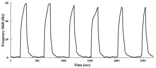 In addition to sensitivity, determining whether a gas sensor is capable of satisfactory performance and development requires the examination of its repeatability. Ideally, when a sensor is repeatable, it generates the same frequency response when the same operation method and analyte gas are repeated. In this study, 750 ppb ammonia was implemented in the six-cycle consecutive test for the proposed SAW sensor. As shown in Figure 8, the frequency response was 59 Hz in the first cycle and 55 Hz in the sixth. The repeatability is expressed as follows: