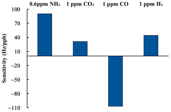 Selectivity refers to whether a gas sensor can respond to one specific target gas without being influenced by other gases. In this study, 1 ppm CO2, 1 ppm CO, and 1 ppm H2 were employed as interfering gases. Figure 10 illustrates the results of the selectivity test, with the vertical axis (Hz/ppb) indicating the sensitivity of the sensor to various gases. It is clearly seen from Figure 10 that the sensitivity of the proposed SAW sensor to 600 ppb NH3 gas is over two times higher than 1 ppm CO2 and 1 ppm H2, but the sensitivity to 1 ppm CO shows negative frequency shifts. Accordingly, the SAW sensor coated with rGO/DPP2T-TT composite film is capable of detecting ammonia at sub-ppm concentration levels in dry air at room temperature when interfering gases are present.