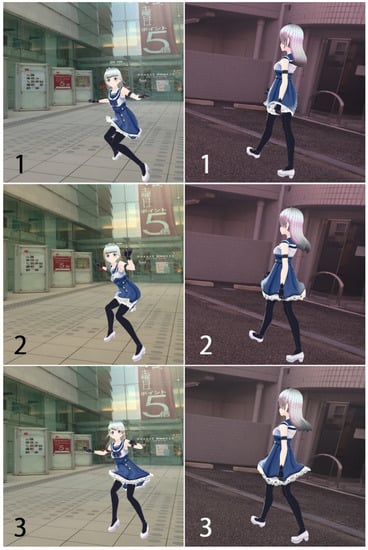 We used the Common Objects in Context (COCO) 2017 dataset first as training data of 2D human pose estimation. Additionally, to create the original training dataset of 3D pose tracking, 90 original humanoid CG characters created by ourselves (VRM format) were prepared. All humanoid CG characters had a form (skeleton) annotating the 3D coordinates of the 24 following key points: the center of the body (navel), nose, left and right ears, eyes, shoulders, elbows, wrists, thumbs, middle fingers, hips, knees, ankles, and toes. The cubes surrounding the full bodies of the humanoid characters were determined, all 3D coordinates of the 24 key points were normalized, and 2D images were developed with a size of 448 × 448 pixels of red–green–blue (RGB) color images at a maximum frame rate of 60 frames per second (fps). The videoframe was set to a square with the origin in the depth direction to the center of the character’s body. Therefore, the 3D coordinates of the humanoid models were the relative coordinates based on the center of the body without the ground information in the local coordinate system, not the absolute coordinates in the global coordinate system. In addition, the relative coordinates were transformed so that the length from the center of the body to the center of the head was 1 and the length from the center of the body to the ankle joint was 1, regardless of the height in the relative local coordinate system. By capturing the motion of 90 humanoid characters on the Unity system 2019.4 using a virtual camera, more than one million 2D digital images were created as the original 3D pose tracking dataset for the input training data of deep learning, described in Section 2.3. Figure 1 shows the sample images of the original 3D pose tracking dataset which had three continuous 2D images of one humanoid character dancing and walking. The correct relative 3D coordinates based on the skeleton information of these two 3D datasets were attached as Supplementary Data (training dataset sample.txt).