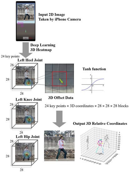 We developed a novel iOS application for a markerless motion capture system that estimates 3D human body poses from 2D video images of a person using an iPhone camera. Human motion capture is defined as a process of digitally recording the movements of a person by tracking pixels. Recently, motion tracking technology using deep learning has been subject to rapid progress. OpenPose, an open-source system for multi-person 2D pose estimation using Part Affinity Fields, has been applied to estimate the 3D coordinates []. Although the method of lifting 2D joint position coordinates to 3D spatial coordinates using the convolutional neural network is a great idea, this method requires specialized knowledge and is suitable for researchers. On the other hand, our newly developed application dose not need to extract image data from the smartphone, and users do not need to provide new training data; coordinate estimation is completed inside the smartphone. ResNet has been known as an innovative deep convolutional neural network applied in image recognition tasks. ResNet achieved top results for object detection and object detection with localization tasks in the competition of ImageNet Large Scale Visual Recognition Challenge (ILSVRC) 2015 []. As the number of layers of the neural network increases, the accuracy levels may become saturated and slowly degrade after a point. ResNet overcame this limitation by using residual blocks and skipping connections to improve accuracy and reduce training time. Our method is novel in image recognition technology using the state-of-the-art ResNet model in that three consecutive 2D images were used for deep learning as movies rather than static images capturing a moment of motion. Furthermore, we could prepare sufficient training 3D datasets using the original humanoid CG characters with skeletal information created by ourselves to learn human motion. In addition, we used the novel technology of 3D heatmaps with regression models proposed by Sun et al. []. The validity and effectiveness of this method has been convincingly verified in various settings, particularly comprehensive ablation experiments with 3D pose estimates []. They employed a small set of 2D images tracked from a monocular video sequence to reconstruct 3D motion. The advantage of the 3D heatmap method is that it visualizes the region in which the network focuses as an attention map, which can clarify the reason for the network decision-making in a visual explanation. The visual explanations enable us to analyze and understand the internal states of convolutional neural networks, which is efficient for engineers and researchers.
