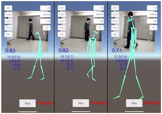 Snapshots of the TDPT for Gait Test (TDPT-GT) application and calculated 3D joint angles and artificial intelligence (AI) scores, also called the confidence scores in a healthy young volunteer. The iPhone was fixed as horizontal as possible to the floor. The entire body of the subject from the head to the toes must always be in the videoframe. The blue-colored number at the left of the videoframe shows the reliability of the position information of the entire body as an AI score, and the small numbers below show the 3D angles (AI scores) of the left and right knee joints, and (AI scores) of the left and right ankle joints.