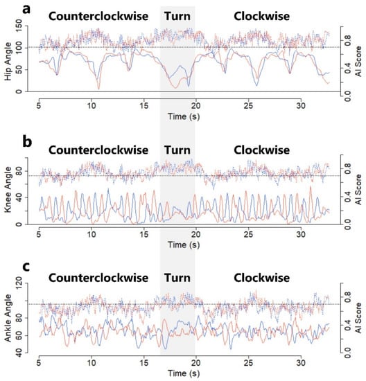 Three-dimensional angles (solid lines) calculated by the relative 3D coordinates estimated by the TDPT for Gait Test (TDTP-GT) application and artificial intelligence (AI) scores (dotted lines). When each AI score is 0.7 (black dotted line) or higher, the 3D angles at the right (blue) and left (red) hip joints (a), knee joints (b), and ankle joints (c) are considered to be relatively reliable.