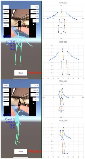 Simultaneous measurement by two methods of TDPT for Gait Test (TDPT-GT) application and Vicon Motion System. Blue dots indicate 3D coordinates; blue lines indicate both upper extremities, yellow indicates the trunk, gray indicates the left lower extremity, and orange indicates the right lower extremity.