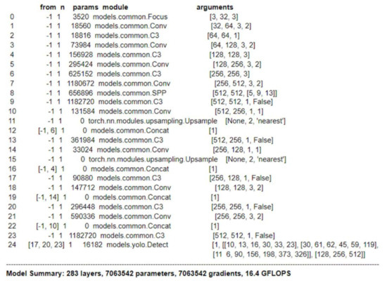 YOLOv5 is the newly released version of the Yolo family. It is a leading-edge deep learning algorithm that is very time performant and produces object detection models which are relatively smaller in size. For this paper, we chose its lightweight version called YOLOv5s (small). It is a 283-layers deep neural network with over 7 million trainable parameters. For more information about the layers, please refer to Figure 1 given below.