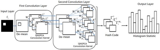 In order to overcome the problem that the convolution kernel of quaternion sparse principal component analysis is not sparse enough, the quaternion non-convex sparse principal component analysis network (QNSPCANet) based on regularization is proposed in this section: the establishment of the quaternion non-convex sparse PCANet model with regularization constraints, the quaternion sparse vector solution based on coordinate descent method, and the variable solution based on fixed point iteration method are proposed in order to obtain a more sparse convolution kernel and further improve the recognition performance. The basic framework of a two-order QNSPCANet is shown in Figure 1.