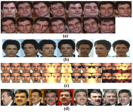 In this section, four color face datasets including Georgia Tech [], Color FERET [], AR [], and LFW-A [] were selected to conduct algorithm simulation experiments. Color face image samples of four datasets are shown in Figure 2.