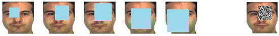 For AR dataset, each person should have 26 face images, among which, eight have no occlusion factor, six have illumination change, six have sunglasses occlusion, and six have scarf occlusion. The experiment can be divided into five groups: (1) in the first group, under the condition of no occlusion, nine images were randomly selected from 14 images with no occlusion containing light changes to form the training set, and the remaining five images were formed into the test set; (2) in the second group, 14 face images without occlusion were included in the training set, and six face images with sunglasses occlusion were included in the test set; (3) the third group was scarf occlusion, 14 images without occlusion were used as the training set, and six images with scarf were used as the test set; (4) the fourth group was in the condition of self-added pure color occlusion. The training set consisted of nine randomly selected face images without occlusion, and then added blue occlusion blocks (about 20% occlusion area) to the remaining five images, which were used as test samples; (5) and the fifth group was the condition of salt-and-pepper noise occlusion. Nine images were randomly selected from 14 images without occlusion as the training set, and then the remaining five images were added with salt-and-pepper noise blocks as the test set. Color face samples of the AR dataset, self-added solid color occlusion of images, and different areas of salt-and-pepper noise occlusion are shown in Figure 3.
