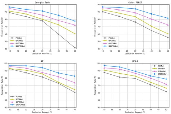 Figure 4 shows the recognition rate curves of each algorithm under different solid color occlusion areas. As can be seen from the figure, with the increase in the occlusion area, the gap between the correct recognition ability of the four recognition algorithms gradually increases and QNSPCANet performs better under different occlusion areas.