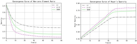 The proportional convergence curve of non-zero elements of the sparse matrix and the convergence curve of Hoyer′s sparsity are shown in Figure 5.
