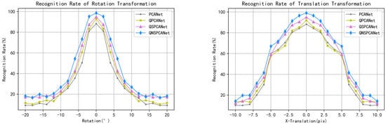 Then, a certain degree of rotation transformation and translation transformation were carried out on the samples of the test set to construct similar samples to test the stability of the model for transformation. For the image rotation transformation processing, the overall rotation angle increases within the range of ; for translation transformation processing, pixels of image can be translated based on the horizontal direction. Figure 6 shows the correct recognition rate curves of the four algorithms under different rotation and translational transformations.