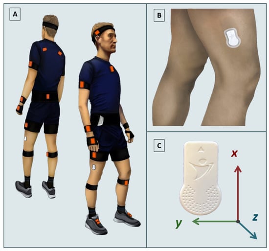 (A) Simultaneous application of SENS and Xsens sensors (Xsens sensors are shown on top of clothing for illustrative purposes). (B) Placement of a SENS sensor on the distal lateral side of the thigh. (C) Coordinate axes of the SENS sensor.