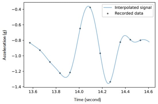 Reconstruction of continuous SENS signal using the Fourier method. The gray dots show the accelerations recorded by the SENS sensors along the x-axis as an example of one gait cycle. The blue line shows the continuous signal reconstructed using the Fourier method.