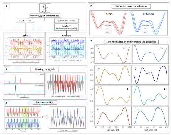 An overview of the signal processing protocol used in this study: (A) Simultaneous recording of the gait signals obtained with SENS and Xsens during two overground gait trials. (B) Inspection of the PSD (power spectral density) of the signals and filtering of the signals after determining a cutoff frequency of 4 Hz using a fourth-order zero-lag low-pass Butterworth filter. (C) Temporal matching of the signals using the cross-correlation method. (D) Segmentation of the gait into five individual gait cycles. (E) Averaging and normalization of the gait cycles into gait cycle percentages with respect to different coordinate axes and the magnitude vector.