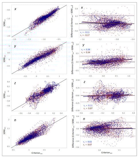(Left column): scatterplots demonstrating the correlation between the SENS and Criterion accelerations with respect to different axes. The black line depicts the line of equality (SENS acc = Criterion acc). (Right column): Bland–Altman plots demonstrating the agreement between the SENS and Criterion accelerations. The upper and lower LoAs (limits of agreement) are shown as the upper and lower dashed lines corresponding to the 2.5th and 97.5th percentiles of the differences. (Data from the right-side sensor are marked in blue, and those from the left-side sensor is marked in red).