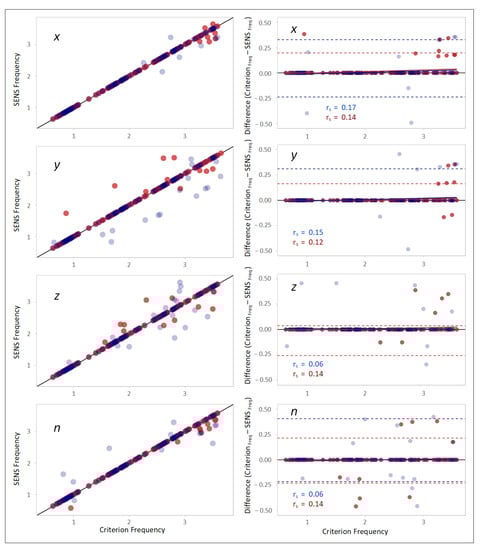 A high correlation was found in the scatterplots between the frequencies of the PSD peaks of the SENS and Criterion signals (Figure 5). The Bland–Altman plots also demonstrated good agreement, especially at lower frequencies, as the differences increased at higher frequencies. Spearman’s correlations between Criterion–SENS frequency differences and the Criterion frequency for both sides were 0.16, 0.14, 0.09, and 0.25 with respect to the x-, y-, and z-axes, and the vector magnitude (n), respectively (Figure 5).