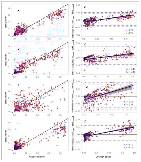 (Left column): scatterplots demonstrating the correlation between the powers of the peaks of the PSDs of SENS and Criterion with respect to different axes. The solid black line depicts the line of equality (SENSpower == Criterionpower). (Right column): corresponding Bland–Altman plots demonstrating the agreement between the powers of the peaks of the PSDs of SENS and Criterion. The upper and lower LoAs are shown as the upper and lower dashed lines corresponding to the 2.5th and 97.5th percentiles of the differences. (Data from the right-side sensor are marked in blue, and those from the left-side sensor are marked in red).