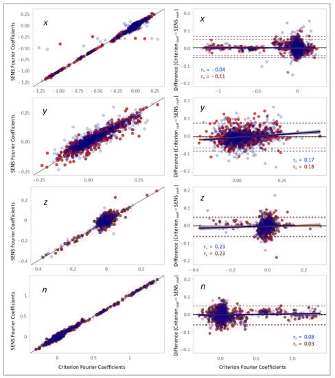 (Left column): scatterplots demonstrating the correlation between the Fourier coefficients of SENS and Criterion with respect to different axes. The solid black line depicts the line of equality (SENS coefficients == Criterion coefficients). (Right column): corresponding Bland–Altman plots demonstrating the agreement between the Fourier coefficients of the peaks of the PSDs of SENS and Criterion. The upper and lower LoAs are shown as the upper and lower dashed lines corresponding to the 2.5th and 97.5th percentiles of the differences. (Data from the right-side sensor are marked in blue, and those from the left-side sensor are marked in red).