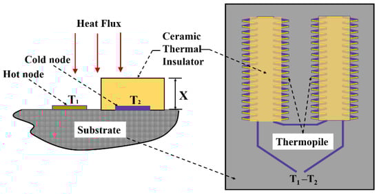 The TFHFS consists of a substrate, a thermopile, and a thermal insulator layer. The thermopile contains 72 thermocouples that convert temperature difference () signals into electrical signals based on the Seebeck effect [20]. The structural design is shown in Figure 1. This design converts longitudinal heat flux into a transverse temperature gradient. In heat-flux tests, heat transfer between hot and cold nodes should be avoided as much as possible because it is not directly caused by the heat flux in the normal direction, and will consequently introduce measurement errors.