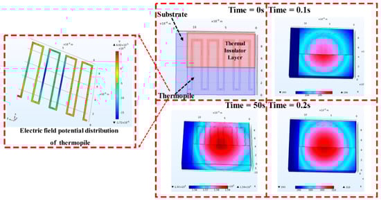 In order to study the factors influencing the dynamic characteristics of the TFHFS, finite element simulation software was used to build a simplified model in 3-D (i.e., in three dimensions). The initial ambient temperature was 20 °C, and the laser provided a thermal load of 3 MW/m2. The laser spot radius was 8mm, which can completely cover the sensor, and the laser power was Gaussian, distributed on a two-dimensional plane to fit the actual calibration conditions. At the same time, the natural convection heat dissipation of the air as well as the radiation heat dissipation of the film surface to the environment were taken into account. The convective heat transfer coefficient, and the surface emmissivity were 10W/(m2·K) and 0.25, respectively. The three-dimensional temperature dynamic process of the TFHFS, and the potential distribution of the thermopile under the above conditions are shown in Figure 2. This simulation is the result of coupling solid heat transfer with the thermoelectric effect. Therefore, the dynamic error caused by the approximate substitution of the temperature difference for heat flux, which occurred in previous studies, was avoided.