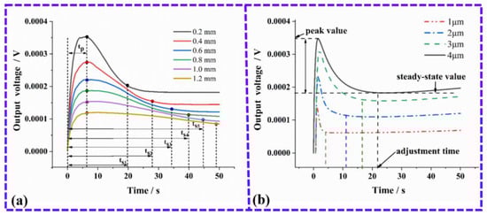 Based on the previous results of Zhang et al., it is known that the step-response of a TFHFS is independent of the excitation heat flux. Therefore, this research mainly studied the influence of the layer thickness of the thermal insulator, and the thickness of the substrate on the dynamic characteristics of the sample. The step-response simulation of the TFHFS under different substrate thicknesses is shown in Figure 3a. With increasing thickness of the substrate, the adjustment time () increases, meaning that the dynamic characteristic of the sensor gets worse. Figure 3b shows the step-response simulation of the TFHFS under different thermal insulator layer thicknesses. It can be seen that under the same heat-flux excitation (3 MW/m2), the greater the thickness of the thermal resistance layer, the higher the static sensitivity of the sensor, but the worse the dynamic characteristic.