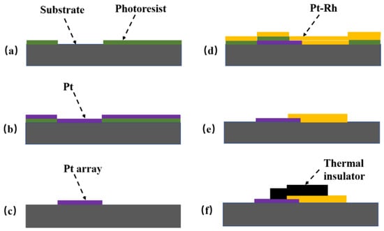 Preparation process of the TFHFS (a–f). (a) A layer of photoresist was sputtered onto the substrate; (b) the 0.3-micrometer Pt electrode was sputtered; (c) the photoresist was removed; (d) the 0.3-micrometer Pt-Rh13 electrode was sputtered; (e) the photoresist was removed again; (f) the thermal insulator layer was deposited with a thickness of 2.5 μm.