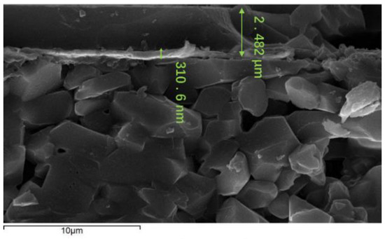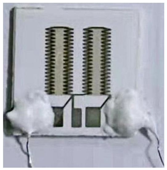 The TFHFS was fabricated using MEMS technology. Silicon dioxide was chosen as the thermal insulator, and the substrate material was alumina. The thermopile materials used were platinum and platinum-13% rhodium. The film was imprinted via microlithography and stripping, as shown in Figure 4. The physical picture of the sample and the characterization results of the film thickness are shown in Figure 5 and Figure 6, respectively. A preliminary static calibration experiment showed that its sensitivity was 2.0 × 10−5 mV/(W/m2).