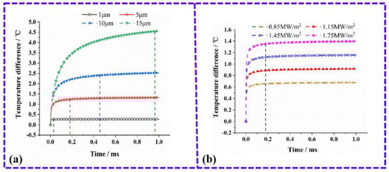 (a) Verification results of the theoretical model with different thicknesses of the thermal insulator layer; (b) Verification results of the theoretical model with different heat–flux densities and the 2.5–micrometer thermal-insulator layer.
