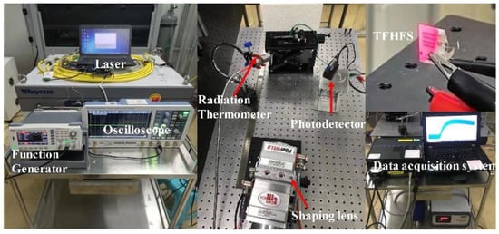 The test device includes a semiconductor laser, a function generator, a beam shaping lens set, a high-speed infrared radiation thermometer, a THORLABS DET10A/M silicon photodetector (with a rise time and wavelength of 200–1100 nm, respectively), and a data acquisition system, as shown in Figure 8. In this experiment, it was assumed that the transverse heat conduction from the hot node to the cold node of the TFHFS can be neglected compared with the longitudinal excitation of large heat flux. The high-power semiconductor laser was used as a dynamic heat-flux source. The laser had a maximum output power of 6000 W, and a wavelength of 915 nm located in the infrared region. The function generator can modulate the output mode of the laser, and the laser beam can illuminate the sample surface through the quasi-lens group. Finally, the surface temperature of the TFHFS was collected using a high-speed infrared radiation thermometer in real time.
