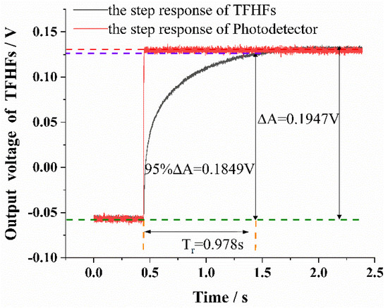 Setting the laser power, , and the spot radius to 600 W and 8 mm, respectively, the heat-flux density, , was found to be 3 MW/m2. The step laser was modulated by a function generator. When the output of the TFHFS reaches a steady-state value, the step response amplitude was recorded, followed by calculation of the steady response time, . The experimental results are shown in Figure 9, and it can be seen from the experimental curve that the rising edge of the laser signal measured by the photodetector is close to the ideal step signal. The amplitude, , and the steady-state response time, , were 0.1947 V and 0.978 s, respectively. Compared with the simulation results in Figure 3, the step response of the TFHFS did not overshoot.